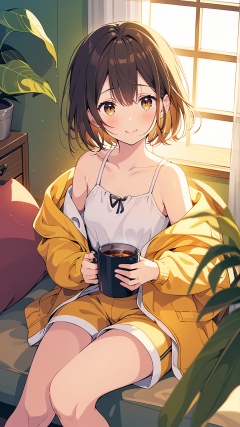 1girl, solo, brown hair, brown eyes, cup, window, sitting, blush, holding cup, holding, shorts, short hair, pillow, indoors, plant, mug, curtains, potted plant, blurry, camisole, sunlight, off shoulder, collarbone, shirt, bangs, smile, closed mouth, white shirt, yellow shorts, jacket, long sleeves, depth of field, twitter username, open clothes