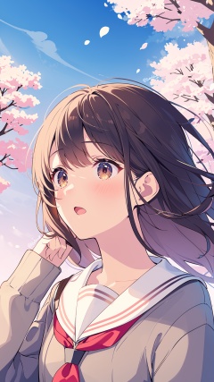 1girl, solo, long hair, brown hair, school uniform, cherry blossoms, outdoors, brown eyes, serafuku, sky, upper body, white sailor collar, petals, sailor collar, bangs, day, red neckerchief, flower, long sleeves, neckerchief, hand up, twitter username, blue sky, tree, parted lips, open mouth, cloud, cardigan, floating hair, sleeves past wrists