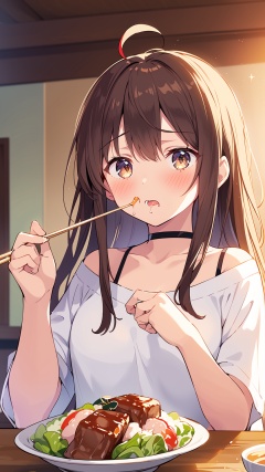 1girl, solo, food, holding, chopsticks, long hair, holding chopsticks, shirt, white shirt, blush, bangs, brown hair, looking at viewer, drooling, ahoge, brown eyes, off shoulder, sparkle, blurry background, choker, indoors, bowl, blurry, bow, off-shoulder shirt, +_+, black choker, holding spoon, collarbone, hair bow, upper body, light brown hair, short sleeves