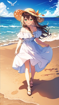 1girl, hat, dress, outdoors, long hair, holding, white dress, solo, green eyes, beach, off-shoulder dress, bird, looking at viewer, ocean, holding shoes, day, off shoulder, barefoot, bangs, bare shoulders, blush, holding clothes, water, standing, hair between eyes, shoes, sandals removed, footprints, sand, sky, sun hat, parted lips, cloud, ribbon, brown hair, floating hair, sandals, blue sky, breasts, smile, shoes removed, collarbone, hat ribbon, waves, straw hat, frilled dress, seagull