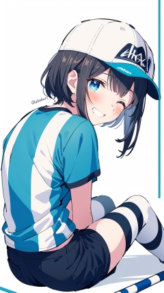 1girl, swept bangs, oozora subaru, solo, shirt, virtual youtuber, hat, striped, bangs, one eye closed, striped shirt, short hair, smile, looking at viewer, vertical-striped shirt, vertical stripes, blue eyes, thighhighs, white shorts, grin, shorts, v, white background, shoes, baseball cap, blush, sitting, sneakers, white footwear, simple background, looking back, twitter username, short sleeves, mismatched legwear, backwards hat, red thighhighs, black hair, brown hair, asymmetrical legwear, t-shirt, from behind, sideways hat
