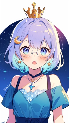 1girl, himemori luna, solo, virtual youtuber, jewelry, heterochromia, dress, crown, pink hair, purple eyes, hair ornament, earrings, glasses, food-themed hair ornament, ahoge, multicolored hair, candy hair ornament, crescent earrings, green eyes, necklace, mini crown, looking at viewer, blush, bracelet, blue dress, crescent, short hair, bangs, gradient hair, purple hair, white background, starry sky print, twitter username, open mouth, star (symbol), simple background, off shoulder, hairclip, :o, blue hair, collarbone, upper body