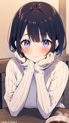 sweater, blush, purple eyes, white sweater, cup, black hair, 1girl, bangs, looking at viewer, long sleeves, indoors, closed mouth, ribbed sweater, sitting, short hair, head rest, table, solo focus, sleeves past wrists, coffee mug, hands up, mug, upper body, turtleneck sweater, coffee, twitter username