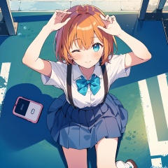 1girl, one eye closed, solo, skirt, school uniform, shirt, blue skirt, cellphone, short hair, blush, socks, phone, looking at viewer, white shirt, brown footwear, sitting, bow, suspenders, shoes, pleated skirt, short sleeves, orange hair, white socks, bangs, smartphone, aqua eyes, arm up, suspender skirt, looking up, bowtie, reflection, blue eyes, twitter username, from above, outdoors, sky