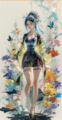 Girl, butterfly, forest, sunset, falling flowers, blue hair, long hair, long legs, high-definition, jellyfishforest, midjourney portrait, qingsha, faxa