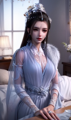 masterpiece,(best quality),official art, extremely detailed cg 8k wallpaper,((crystalstexture skin)), (extremely delicate and beautiful),highly detailed,1girl,solo,long hair,headwear,(sitting)),(hair),,(clothes:0.999),(dress:0.987),(chinese_clothes:0.897),(upper body),(medium breasts),((hair_ornament)),jewelry,earrings(sunshine, indoor,bed),((looking_at_viewer)),((Facing the camera)),, <lora:hipoly3DModelLora_v10:0.3>