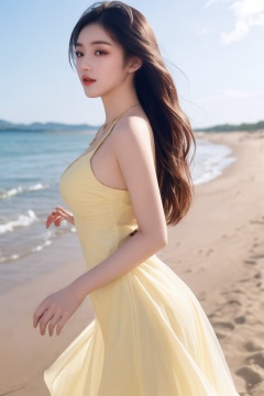 (best quality:1),(from_side:1.1),(fondle_breasts:1.1),18-years-old beautiful (open_see-through_yellow_dress,see-through_G-string,pantyshot,gradient hair,long wavy hair,necklace) girl,makeup,(running at the sandbeach),solo,light_blush,
