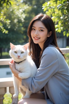The image features a beautiful young Asian woman with long, dark hair sitting on a balcony with a cat in the background. The woman is looking into the camera with a smile on her face, her eyes sparkling with joy and contentment. Her hair is neatly styled and her makeup is natural yet enhance her features. She wears a black coat that complements her skin tone. The lighting in the image is natural and warm, casting a soft glow on the woman and the surrounding environment. The colors in the image are vibrant and rich, with the blue sky and green trees in the background providing a beautiful contrast to the woman and the cat. The style of the image is casual yet elegant, with the woman's outfit and the setting creating a relaxed and comfortable atmosphere. The quality of the image is excellent, with sharp details and smooth transitions between colors and tones. The woman's action in the image is sitting and smiling, with her hands resting on the railing. Her posture and facial expression convey a sense of happiness and contentment, as if she is enjoying a peaceful and pleasant moment. The woman's expression and the overall atmosphere of the image suggest a sense of relaxation and enjoyment. She seems to be in a good mood, perhaps enjoying a leisurely day or spending time with her cat. The image captures a moment of tranquility and happiness, making it a beautiful and memorable scene.,Film Photography
