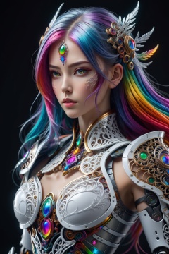 surreal photography of a stunning beautiful cyborg female, rainbow hair, long hair, huge breast, (beauty and detailed armor), embraced, delicate white filigree, intricate filigree, glowing, navel, highly detailed, intricate detailed, face symmetry, masterpiece, award-winning, sharp focus, concept art, low key, 8k, uhd, low key, octane render