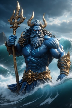 Poseidon, lord of the seas, glowing white eyes, wearing blue garments, trident in hand, commanding the waves of the seas, full body portrait dim volumetric lighting, 8k octane beautifully detailed render, post-processing, portrait, extremely hyper-detailed, intricate, epic composition, cinematic lighting, masterpiece, very very detailed, masterpiece, stunning Detailed matte painting, deep color, fantastical, intricate detail, splash screen, complementary colors, fantasy concept art, 8k resolution trending on Artstation Unreal Engine 5