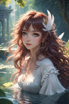 (extremely detailed CG unity 8k wallpaper),(((masterpiece))), (((best quality))), ((ultra-detailed)), (best illustration),(best shadow), ((an extremely delicate and beautiful)),dynamic angle,floating, solo,((1girl)),{long wavy curly hair},expressionless,((white idol dress)), anglesailor dress,(detailed wet clothes),silk shawl,bikini,underboob, frills,cute anime face,blush,(beautiful detailed eyes), (detailed light),feather, nature, (sunlight), river, (forest),(((floating palace))),beautiful and delicate water,(painting),(sketch),(bloom),(shine),