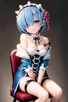 1girl, solo, blue hair, blue eyes, short hair, rem (re:zero), hair ornament, sitting, looking at viewer, strap slip, x hair ornament, hair over one eye, breasts, off shoulder, hand between legs, between legs, head tilt, chair, hairclip, incredibly absurdres, highres, , masterpiece, best quality, , masterpiece, best quality
