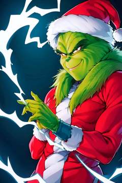 <lora:ricegnat_style:0.8>,((masterpiece,best quality)), absurdres,(energy, aura, electricity,:1.1) ,muscular,<lora:Grinch_v2:0.8>, Grinch,Grinch_Classic, green skin, green fur,simple background, 1boy, upper body, male focus, black background, christmas, santa costume, <lora:Super_Saiyan_4_Goku_Anime:0.6>, Super_Saiyan_4_Goku, male focus, super saiyan, tail, wristband, pants, red fur, black hair, solo, smiling,looking at viewer, cowboy shot,