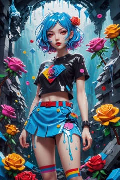 Abstract Pop Surrealism: A fusion of abstract, pop, and surreal styles brings forth a woman in a miniskirt, draped in a playful cosplay uniform, showcasing cute panties in a vibrant, dreamlike setting. ,sticker,dripping paint,roses_are_rosie,neon photography style,tshirt design,ice and water,tranzp,lego