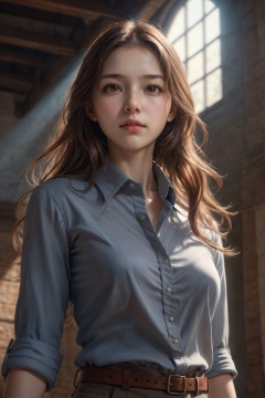 photorealistic, masterpiece, best quality, raw photo, 1girl, solo, long hair, brown hair, detailed face, alluring face, collared shirt, medium breasts, dynamic pose, looking at viewer, from below, detailed background, fine detailed, intricate detail, ray tracing, depth of field, low key, hdr