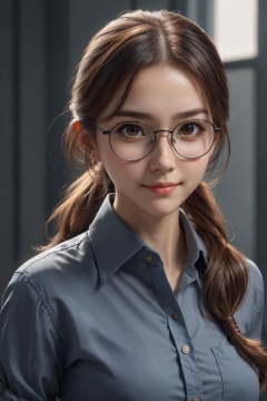 photorealistic, masterpiece, best quality, raw photo, 1girl, solo, long hair, brown hair, detailed face, alluring face, collared shirt, medium breasts, dynamic pose, looking at viewer, from below, detailed background, fine detailed, intricate detail, ray tracing, depth of field, low key, hdr,ponytail, black glasses, big eyes, big eyebrows, smile