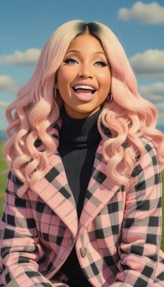 by Guillermo Del Toro, Verdure Tapestry, Pencil painting of a Lovely (Nicki MInaj wearing A light pink and black checkered coat with a black turtleneck while Clenching jaw:1.2) , happy, Sitting with hands around ankles, Platinum hair, Pores, Clear skies, soft focus, American Scene Painting, Concept artist, key visual, HDR, laughing uncontrollably super funny