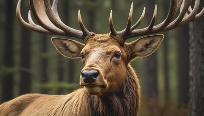RAW photo, VRay, hyper detailed, Dutch angle shot of a Magnificent hybrid Elk, Ultra Detailed, Direct light, Orton effect, Kodak gold 200, Selective focus, by Ossip Zadkine, Paul Strand, extremely content happy smile