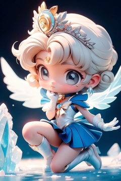 1girl,mer1,(tiara:1.3),sailor senshi uniform,blue sailor collar,bow,knee boots,choker,white gloves,blue choker,elbow gloves,jewelry,earrings,blue skirt,detailed background,(detailed light),looking_at_viewer,beautiful detailed glow,detailed ice,beautiful detailed water,((ice crystal texture wings)),fantasy,chibi,