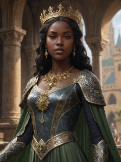 modelshoot style, (extremely detailed CG unity 8k wallpaper), full shot body photo of the most beautiful artwork in the world, medieval queen, green vale, dark skin, black woman, dark skin, golden crown, diamonds, medieval architecture, professional majestic oil painting by Ed Blinkey, Atey Ghailan, Studio Ghibli, by Jeremy Mann, Greg Manchess, Antonio Moro, trending on ArtStation, trending on CGSociety, Intricate, High Detail, Sharp focus, dramatic, photorealistic painting art by midjourney and greg rutkowski