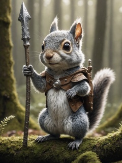 macro camera, illustration of a little magical cute forest creature. The creature IS holding a spear. fantasy art, intricate details, style Jean - Baptiste Monge, style Alan Lee, anthropomorphic squirrel , scene from a movie, dramatic shot angle, atmospheric particles, Real, raw cinematic photorealism, action portrait, 8k, detailed, centered, full frame, depth of field