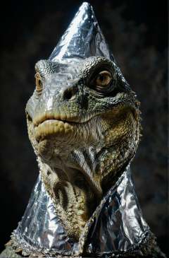 a beautiful high definition crisp portrait of old (reptile:1.2) american president, (tin foil cone on head:1.2), taken with a professional grade camera with exquisite color grading
