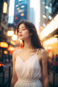 dygqzmv, 1girl, solo, realistic, dress, closed eyes, white dress, building, lips, blurry, brown hair, outdoors, bare shoulders, standing, city, collarbone, long hair, blurry background