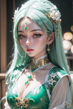 Jade Girl, 1 girl, breasts, half jade, half human, jade carved body, shut up, earrings, eyelashes, gemstones, close-up, jade carved clothes, indoor, detailed portrayal, oversized breasts, white hair, hair accessories, jewelry, lips, long hair, looking at the audience, necklace, solo, upper body, multi-dimensional diffraction paper, Jade Girl
