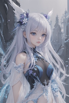 (masterpiece, top quality, best quality, official art, beautiful and aesthetic:1.2),(1girl),extreme detailed,(fractal art:1.3),colorful,highest detailed..,Purple,White,Blue,Chest,Abdomen,Snowflakes falling,(whole body:1.5),a face,(Only one face.:1.1),.,