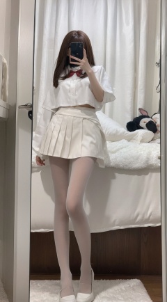 Best quality, 1girl, xtt's bodyA photo of oneself taken with a phone in front of a mirror ,full body, Wearing pure white shirt outside, Wearing black Pleated skirt, wearing pantyhose ,standing, Mobile selfie perspective, shapely body,high heels, xtt