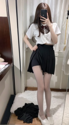 Best quality, 1girl, xtt's bodyA photo of oneself taken with a phone in front of a mirror ,full body, Wearing black Pleated skirt, wearing pantyhose , kneeling, Mobile selfie perspective, shapely body,midnight, xtt