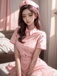 masterpiece, 1 girl, Lovely, Sweet, Long hair, nurse, looking at viewer, pink dress, Pink nurse's uniform, realistic, textured skin, super detail, best quality,