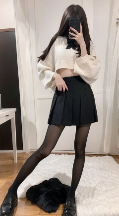 Best quality, 1girl, xtt's bodyA photo of oneself taken with a phone in front of a mirror ,full body, Wearing black Pleated skirt, wearing pantyhose , kneeling, Mobile selfie perspective, shapely body,midnight, xtt