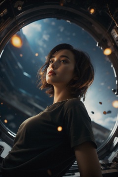 A girl with short hair,Wide Angle,Low Angle,shenkong,light particles,<lora:shenkong-000008:0.7>,