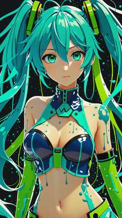 dark blue with green shades, splatter of green and blue, masterpiece, best quality, vivid colors, 35mm film, 8k uhd, hdr, realistic, intricately detailed eyes, splashy splash, detailed hair, intricate details in hair, Hatsune Miku, extremely detailed, navel, make the whole body visible