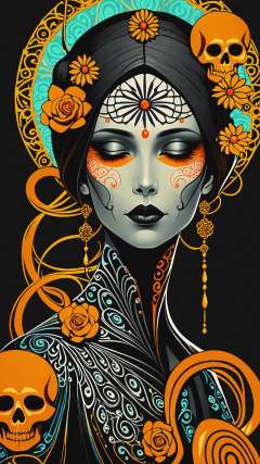Santa Muerte, best quality, digital painting, extremely smooth, fluid, 3d fractals, glowing clothings, light particles, dreamy, smooth, shimmering, dreamy glow, conceptual art by alberto seveso, anna dittmann, arthur rackham, harmonious color scheme, 32k, Wet black and orange color inks line art dreamy female portrait with lot of lace filigrees on black canvas illustration described in the perfect fractal style of Vassily Kandinsky, Jackson Pollock, Alphonse Mucha and Jeremy Mann, HQ, 4K Modifiers: 4K 3D