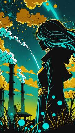 1girl, (from side), (silhouette:1.2), profile, big hair, masterpiece, best quality, light particle, depth of field, field, scenery, fantasy, indigo light, (far away:1.1), cute girl, midriff, tribal sash, pastel colors, chromatic aberration, glow in the dark dark, cloudy sky, space, orange aura, aura, cinematic, dark atmosphere, night , dark hole, glowing eyes, teal light, illumination, light rays, eye in the sky, (grass:0.9), falling petals, oniric portrait of a tall cloaked figure with a white mask, Azem the Traveler, yearning to explore the ends of the world to discover its wonders and help its denizens, by Andy Kehoe, a gradient masterpiece, blue cyan yellow, Rococopunk, luminism, seamless, China ink, Ink Bubbles, Gold leaf lines, alcohol ink elements, curved lines, cinematic, realism, chiaroscuro, Shadow play, Gold leaf small lines, bright splashes of alcohol ink puddles, volumetric light, auras, rays of sunlight, bright colors reflect, isometric, digital art, smog, pollution, toxic waste, chimneys and railroads, 3d render, octane render, volumetrics, by greg rutkowski, anime style