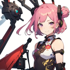 masterpiece, best quality,top quality,(white background:1.5),1girl,solo,pink hair,smile,(china_dress),( cheongsam:1.1),hair ornament,looking at viewer,standing,outdoors,star_in_eye,cyberpunk weapon,<lora:Celluloid_flat_mix_v2:0.8>,upper_body,bust,
