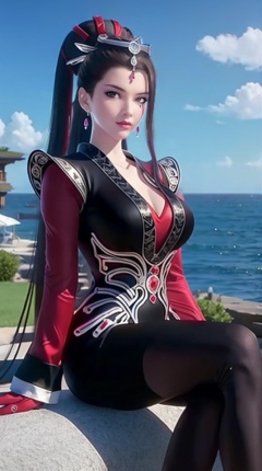 1 girl,Breasts,Black and red dress,Red gloves,Hair accessories,Long hair,(sitting),Blue sky and white clouds background,Standing by the seaside,Thigh height,Black silk pantyhose,ocean,seawater,Water element,Breasts,Cleavage of breast,earring,hairpin,jewelry,solo,Chinese clothing,<lora:e685770ed6959e64ce22cf8755a013f94da37681402fc4a1ae9c2c3c3ed2e05e:0.7>