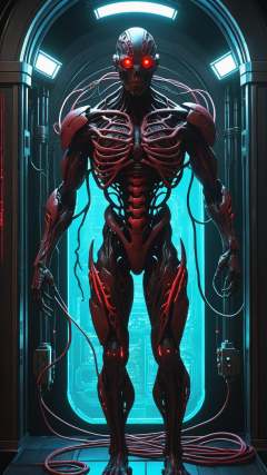 biomechanical cyberpunk a cybermutant fleshmutant, pulsating flesh and biomechanical limbs, fusion of flesh and machine, detailed fleshy skin, black bloody veins growing and intertwining machine and flesh, out of the darkness, veins growing and pumping blood, vascular networks, style of Apterus and zdzislaw beksinski, vibrant colors, Infrared, sparks, lens flare, rim lighting, backlighting, japanese portal, nebula, cinematic, cybernetics, human-machine fusion, dystopian, organic meets artificial, dark, intricate, highly detailed