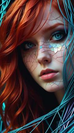 Dark shot, city street, pastel goth, sexy goth girl, photo of cute 24 years old redhead woman, cinematic shot, hard shadows, photorealistic, cute face, looking at viewer, Abstract style mysterious figure emerges from the shadows in a tangled mess of iridescent wires and glowing mesh, color splash 1girl, extreme close-up, face hidden behind layers of glitched wavy distortions, Non-representational, colors and shapes, expression of feelings, imaginative, highly detailed