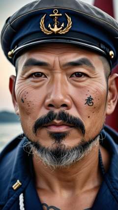 Hyper detailed photo of a captivating portrait of a wise and weathered middle aged sailor, photo of a sailor, ultra realistic photo, 44 years old asian male, goatee, adorned with nautical tattoos and a rugged expression that tells tales of countless voyages, award winning realistic photograph by the world best portrait photographer, overcast day, vivid fantasy colors, nikon, award winning, breathtaking, groundbreaking, superb, outstanding, lens culture landscape awards, photoshopped, evenly lit features, 8k, hi res