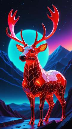 instant christmas, neon red reindeer, high quality fantasy art of a beautiful raging reindeer made of transparent glass, glowing within, delicate figurine, red nose, kawaii, chibi, adorable, flame eyes, ultra Realistic, Extreme Detailed, beautiful Prism light, neon light, Glass made ultra Detailed transparent raging red reindeer, ultra transparent, wearing glass made transparent luxury Armor, Super high definition, reflective pools, HDR, Dark vaporwave color palette, eclipse, glowing archway, huge twisting vines, aerial view of rolling hills in bizarre alien landscape, Fibonacci, Enki, annunaki, monolith, megaliths with eyes, ufo, dna, cosmic serpent, vaporwave tiled liminal space, iris, pixel art, vaporwave aesthetic
