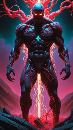 a cybermutant fleshmutant made of pulsating flesh and biomechanical limbs, fusion of flesh and machine, quivering tumors, fleshy growths, mutagenic, cybernetic hoses, wires, anime style, 2d, fighting game style masterpiece, best quality, ultra realistic, 32k, RAW photo, detail skin, 8k uhd, dslr, high quality, film grain,\nShort and messy hair, dynamic, vibrant, action-packed, detailed character design, reminiscent of fighting video games, black bloody veins growing and intertwining out of the darkness, oozing thick neon rainbow blood, veins growing and pumping blood, vascular networks growing, connecting, expanding, red veins everywhere, zdzislaw beksinski, (vibrant colors:1.1), (Infrared:1.2), Rust, Hypercube, ultra detailed, intricate, oil on canvas, ((dry brush, ultra sharp)), (surrealism:1.1), (disturbing:1.1), beksinski style painting, sparks, lens flare, rim lighting, backlighting, RTX, Post Processing, satanic cross, man body, muscular, venom costume, (japanese portal), death shadow nightmare ethereal beast, floating into the abyssal heights, nebula, cinematic, dreaming, Film light, bathing in light, very sharp focus, Hyper detailed, Hyper realistic, masterpiece, spiritual, surreal, atmospheric, maroon cream bronze, High resolution, Vibrant, High contrast, dark angle, 8k, HDR, 500px, dystopian