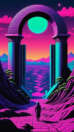 Super high definition, reflective pools, HDR, Dark (vaporwave) color palette, eclipse, glowing archway, huge twisting vines, aerial view of rolling hills in bizarre alien landscape, Fibonacci, Enki, annunaki, monolith, megaliths with eyes, ufo, dna, cosmic serpent, vaporwave tiled liminal space, iris, pixel art, (vaporwave aestethic), (retrowave aestethic), glitch effect