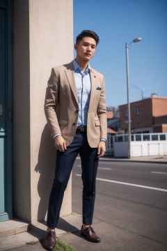 (1man:1.4),(male:1.2),(full body:1.2),(Collared shirt and blazer and suit trousers:1.4),<lora:AsianMan_5:0.8>,