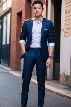 (1man:1.4),(male:1.2),(full body:1.2),<lora:AsianMan_2:0.8>,(Collared shirt and blazer and suit trousers:1.4),