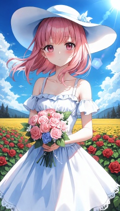 (masterpiece, best quality), 1girl, flower, solo, dress, holding, sky, cloud, hat, outdoors, bangs, bouquet, rose, expressionless, blush, pink hair, flower field, red flower, pink eyes, white dress, looking at viewer, midium hair, holding flower, small breasts, red rose, holding bouquet, sun hat, white headwear, depth of field,