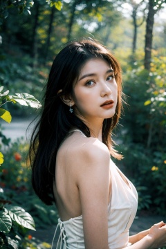 (((masterpiece))), (((best quality))), ((ultra-detailed)), (illustration), ((an extremely delicate and beautiful)),dynamic angle,floating, (beautiful detailed eyes), (detailed light) (1girl), loli, small_breasts, floating_hair,  glowing eyes, pointy_ears, white hair, green eyes,halter dress, feather, leaves, nature, (sunlight), river, (forest),(painting),(sketch),(bloom)