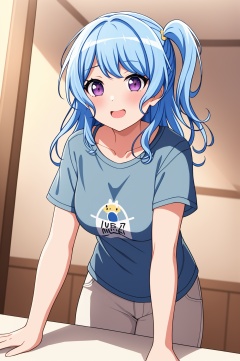 masterpiece,best quality,<lora:HUAYIN11:0.35>,hair one side up,medium breasts,t-shirt,